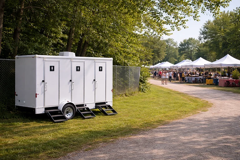 Our trailers are available in multiple configurations to match the size and needs of your event — each unit features interior lighting, ventilation, and climate control. These trailers are commonly used for weddings, festivals, corporate events, and extended projects where appearance and guest comfort matter.